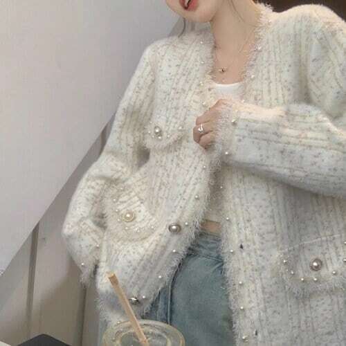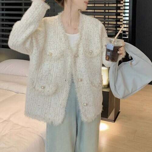 パールモチーフカーディガン ニットカーデ シャギーニット エレガント E639