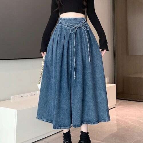 デニムスカート ロングスカート ウエストリボン カジュアル ガーリー E784