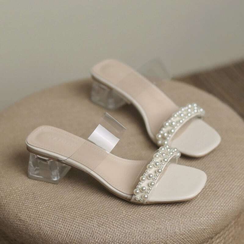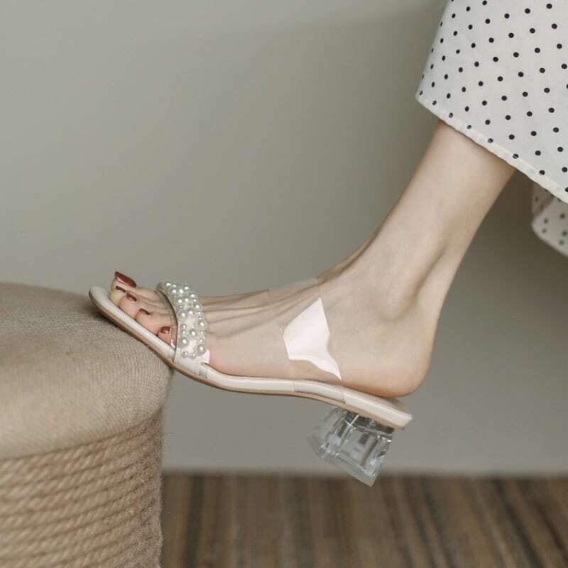 パール付きサンダル クリアサンダル チャンキーヒール ガーリー デート ママコーデ E249